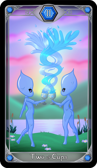 The card depicts a scene of unity and partnership as two elementals raise their cups. Water flows upwards and intertwines, creating a symbol of both harmony and balance, as well as passion and energy. As the sun rises, it adds a new layer of meaning to the card, representing the promise of new beginnings and renewed harmony. This card can represent a new attraction or partnership and is a testament to the beauty and strength of coming together in unity.