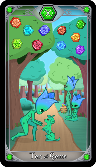 In the Ten of Gems, we see a peaceful and bountiful orchard, where three earth elementals relax and play among the rows of trees. Two of them take a break from the harvest, perhaps reflecting on the fruits of their labor and enjoying the simple pleasures of life. Meanwhile, another elemental plays with a loyal dog, embodying the joy and companionship that comes with a close-knit family. This card is a symbol of legacy and the rewards that come from hard work and dedication. The orchard represents the material comfort and abundance that can be attained through careful cultivation and a commitment to success. But it goes beyond that, showing us the power of connection and community. The elementals in this card are clearly connected, working together to create something that will last for generations to come. They have built a family and a legacy that will endure long after they are gone.