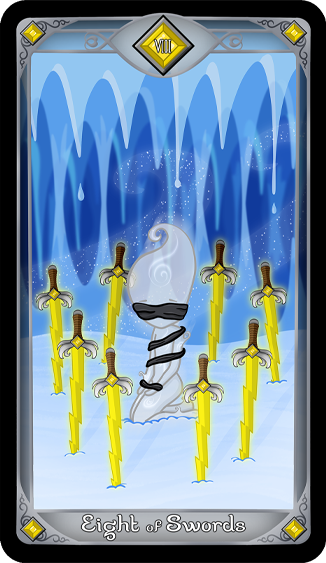 An elemental is bound and blindfolded, with eight swords surrounding them. The swords represent thoughts and beliefs that are holding them back from achieving their full potential. Interestingly, the bindings are not tight, and they could remove their blindfold and easily escape their predicament. However, the fact that they remain bound and blinded suggests that they are trapped by their own limiting beliefs. This card serves as a reminder of the ways in which our thoughts and beliefs can hold us back. Even when we have the power to break free from our limitations, we may find ourselves feeling stuck and unable to move forward.