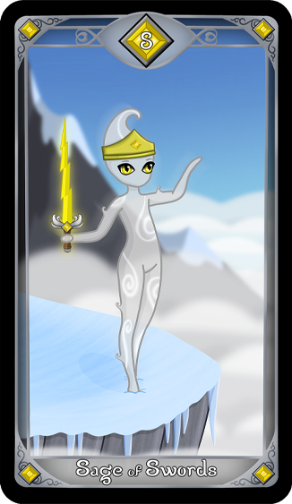 The Sage of Swords stands confidently on a mountain ledge, gazing out at the world with a sense of purpose and determination. Their left hand is lifted upward, as if to receive some higher truth or insight, while their right hand holds a sword raised high and straight, representing their unwavering commitment to discovering the truth in all matters. This elemental is objective, perceptive, and unafraid to confront difficult truths, even when they are uncomfortable or challenging. The mountain ledge symbolizes the heights of intellectual and spiritual attainment, and their confident posture suggests that they are ready and willing to climb even higher in pursuit of knowledge and enlightenment.