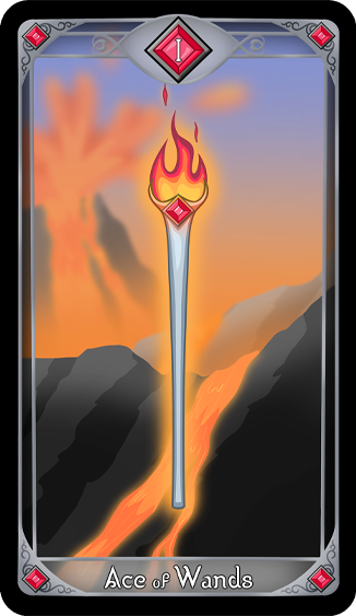 In The Ace of Wands, we are drawn to the wand at its center, a symbol of our inner power and will. In the background, there is an erupting volcano, representing the sudden burst of energy that comes with a new inspiration or passion. The Ace of Wands invites us to embrace our inner fire and take bold, confident action toward our goals and desires.
